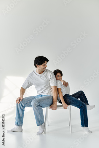 father, son, caucasian, fatherhood, parenthood, childhood, togetherness, an, boy, children, children, quality time, happy, together, posing, chair, white, room, sitting, laugh, playful, moment, bond, family, happiness, indoor, casual attire, relaxed, comfortable, jean, t-shirt, smiling, joy, connection, friendship, memory, father, white background, whitewall, simple, minimalist, bright, key