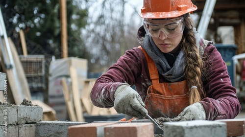 female, bricklayer, safety, gear, laying, brick, trowel, men at work, construction, builder, woman, work, people, building, person, working, industry, outdoors, hard hat, helmet, senior, home, industrial, wood, house, hat, site, mason, children