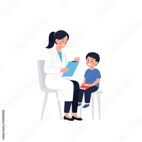 doctor, children, patient, health care, medicals, consultation, exam, paediatrician, clinic, hospital, appointment, treatment, diagnosis, health, care, boy, woman, clipboard, note, record, sitting, chair, white, coat, uniform, blue, shirt, shoe, black, hair, ponytail, smiling, happy, friendly, professional, trust, support, assistance, well-being, wellness, check-up, illustration, cartoon, drawing, graphic, vector, art, design, isolated