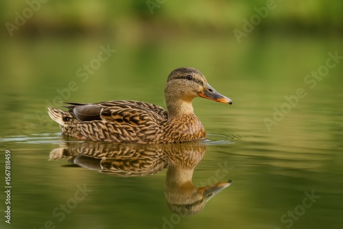 A female duck gliding peacefully across a tranquil pond with a blurred backdrop