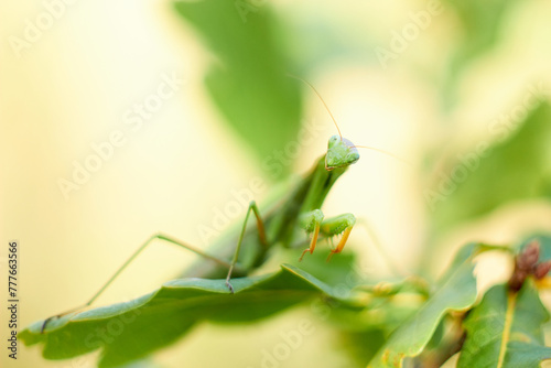 A female European mantis sits on green oak leaves. Mantis Religious. Green mantis, selective focus.