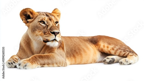 A female lion lies gracefully on a white background, showcasing its majestic features and powerful build.