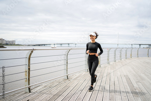 A female runner coach is actively engaged in sports, runs in the city, trains outdoors in sportswear.