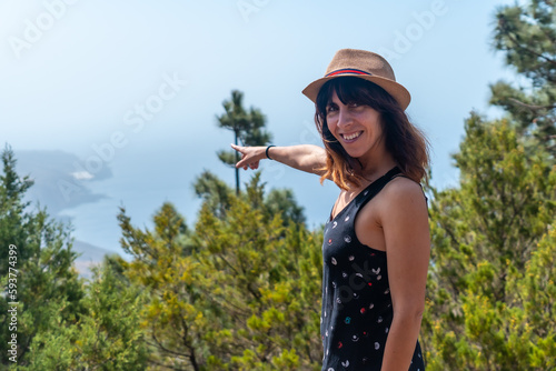 A female tourist with a hat at the El Julan viewpoint on the El Hierro, Canary Islands