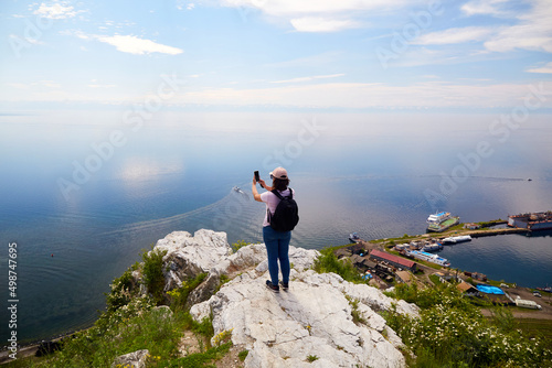 A female traveler stands on a rock near the port of Baikal and photographs Lake Baikal on a summer day. The concept of freedom, hiking.