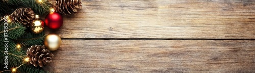 A festive arrangement of pine cones and ornaments on a wooden surface, perfect for holiday celebrations and decorations.