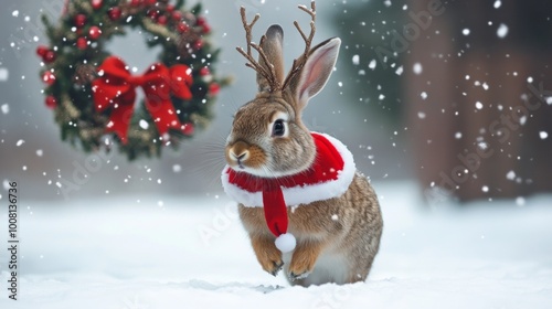 rabbit, rabbit, reindeer, antler, christmas, festive, holiday, winter, snow, white, red, brown, furry, cute, adorable, small, animal, pet, nature, outdoors, background, portrait, closeup, image, photo, season, celebration, december, happy, cheerful, joy, playful, paw, ear, whisker, nose, eye, mouth