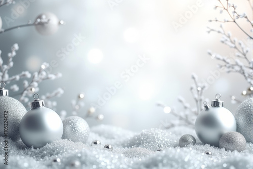 A festive Christmas background with a white backdrop adorned with silver ornaments and snowflakes.