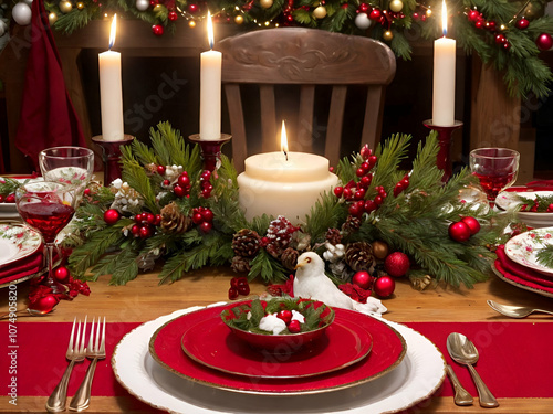 A festive Christmas dinner table set with fine china, candles, and a beautifully roasted turkey surrounded by dishes of vegetables, mashed potatoes, and cranberry sauce.