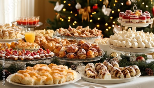 christmas, table, food, dessert, festive, celebration, holiday, gathering, treat, pastry, cookie, sweet, cake, pie, drink, orange juice, family, friends, decoration, buffet, seasonal, party, hospitality, merriment, cheer, oneness, joy, traditional, holiday spirit, feasting, culinary, indulgence, abundance, colours, ambience, winter, sharing, serving, gathering, joyfulness, cookery, event