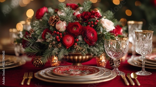 christmas, table, setting, festive, holiday, decor, red, white, gold, flower, pine, branch, centrepiece, dinner, year, christmas, new, decorated, art deco, eatery, home, plate, place, elegant, glasses, background, candle, flames, ribbon, winter, light, star, celebration, colourful, event, season, decoration, fork, seasonal, knife, decorative, tradition, dinnerware, traditional, bell, symbol, candlelight, celebrate, december
