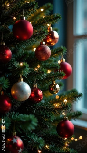 A festive Christmas tree decorated with ornaments and lights, twinkling, holiday season