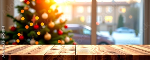 A festive Christmas tree indoors with a wooden table in the foreground. The tree is adorned with ornaments, with soft lights and a view of the street outside through the window.