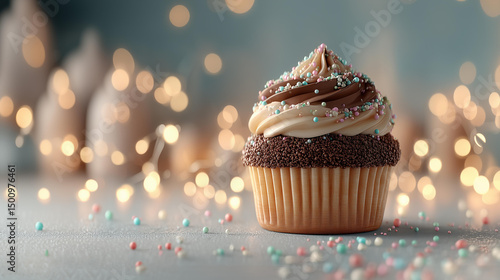 A festive cupcake with chocolate and vanilla frosting and colorful sprinkles sits on a light surface against a soft bokeh of lights..