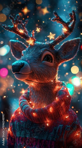 A festive deer adorned with lights and stars, wearing a cozy sweater, creating a cheerful holiday atmosphere in a softly illuminated setting.