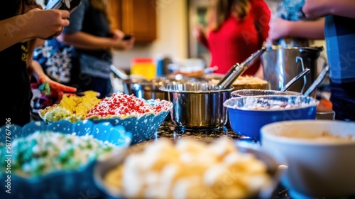 snack, dessert, party, gathering, food, colourful, bowl, popcorn, sweet, treat, celebration, people, kitchen, fun, sharing, socialising, ingredient, festive, homemade, favor, texture, enjoyment, community, family, friends, serving, mixing, preparation, delicious, appetising, variety, atmosphere, cheerful, vibrant, plate, utensil, candy, cookie, cake, ice cream, laughter, smile, togetherness