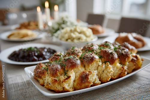 challah, menorah, dinner, table, festive, celebration, jewish, food, tradition, family, holiday, decor, cookery, togetherness, candle, gathering, warmth, bokeh, celebration, greenery, epicure, dish, dining, ambience, seasonal, delicious, new year, meal, baked goods, ritual, gathering, savoury, culture, sharing, colours, hospitality, joy, eating, comfort, widener, platter