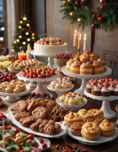 A festive holiday buffet table with a variety of sweet treats, Holiday snacks, Fruit platter