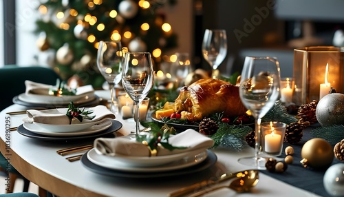 A festive holiday dining experience elegantly set table with delicacies sparkling glassware and a warm christmas ambiance surrounded by cheerful decorations and soft lighting