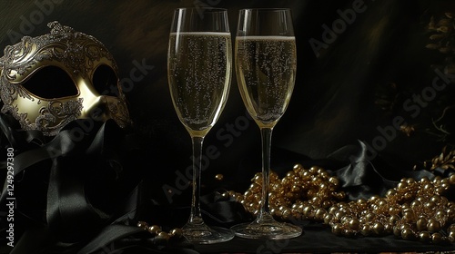 A festive New Year's Eve party with champagne glasses, black ribbons, and gold beads in the background, with an elegant Venetian mask placed on top.