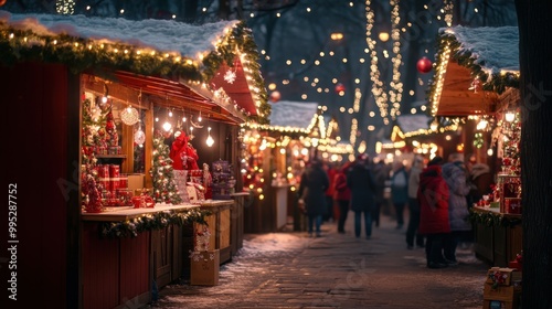 A festive outdoor Christmas market filled with brightly lit stalls selling ornaments, handmade gifts, and hot cocoa, with joyful crowds bundled up against the cold