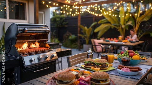 A festive patio barbecue with a modern grill, a table set with classic foods like burgers, hot dogs, and a colorful fruit platter, under a canopy of string lights.