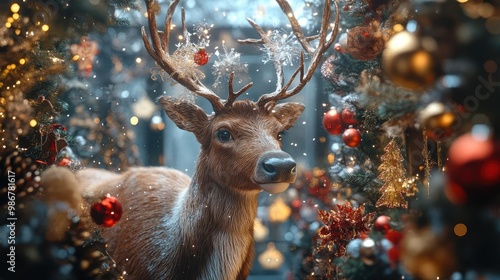 A festive reindeer surrounded by colorful ornaments and sparkling lights, capturing the magic of the holiday season.