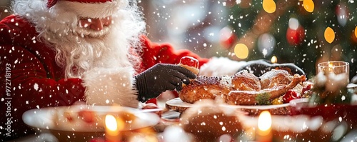 A festive scene featuring Santa preparing a delicious holiday meal amidst falling snow and warm candlelight, evoking Christmas cheer.