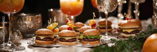 A festive table setting with gourmet sliders and decorative drinks for a celebration.