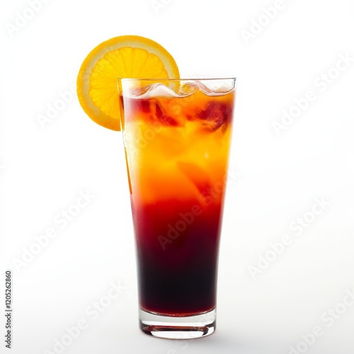 A festive tequila sunrise with grenadine and orange slice, presented against an isolated white background, abstract art style