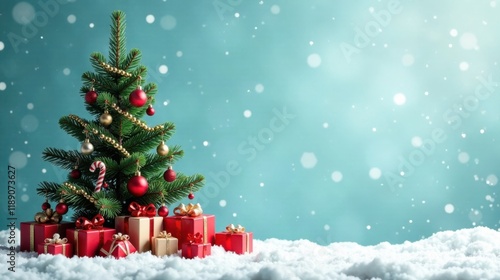 A Festive Winter Scene with a Decorated Christmas Tree and Wrapped Presents in the Snow