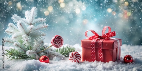A Festive Winter Scene with a Red Gift Box, Candy Canes, and a Frosty Pine Branch in the Snow