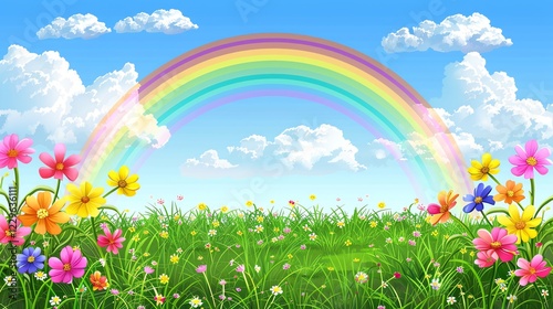 rainbow, flower, field, grass, sky, cloud, nature, landscape, spring, summer, colourful, bright, beautiful, scenic, joy, happy, peaceful, art, illustration, design