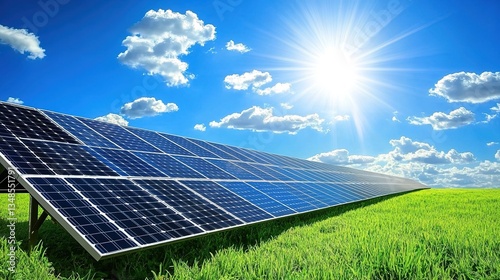 solar, panel, field, green, grass, sunlight, blue, sky, white, cloud, transmission, tower, tree, distance, bright, environmentally friendly, style, strong, lighting, photorealistic, renewable, energy, sustainable, environment, technology, landscape, nature, modern, clean energy, realistic, detailed, sunny, natural, open space, environmental, futuristic