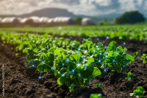 A field of green plants with a blue and white network of lines connecting them. Concept of interconnectedness and growth