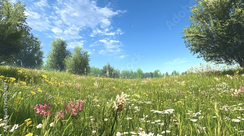 wallpaper, field, flower, meadow, summer, grass, nature, wildflower, green, sky, sun, blue, beautiful, landscape, rural, countryside, spring, natural, blooming, bright, joy, fresh, growth, sunshine, flora, daisy