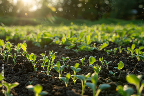 A field planted with green sprouts during the sunrise