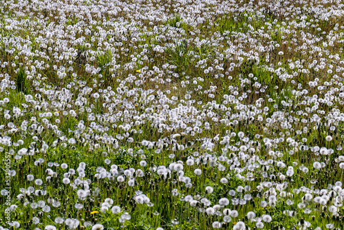 A field with a large number of dandelions in the summer