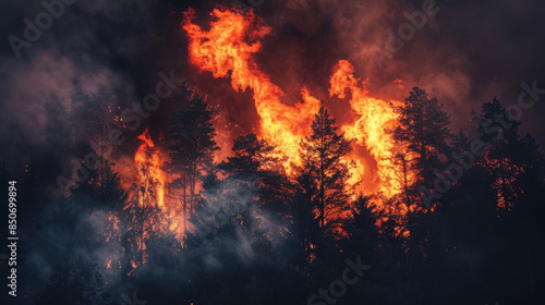 A fierce forest fire with towering flames and thick smoke rising into the sky