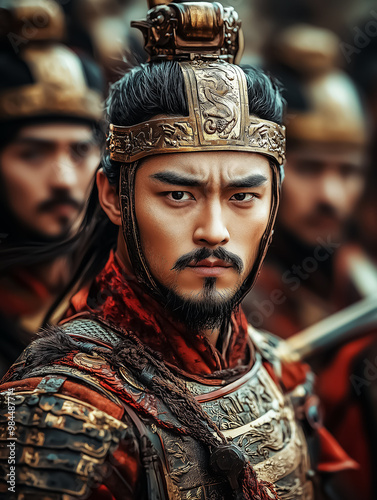 A fierce warrior in ornate armor exemplifying strength and leadership in army, suitable for historical themed films, games, or promotional events.