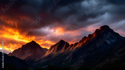 fiery, sunset, dramatic, shadow, craggy, mountain, peak, glowing, sky, peaceful, atmosphere, nature, beauty, outdoors, serenity, adventure, exploration, breathtaking, wilderness, horizon, majestic, landscape, calmness