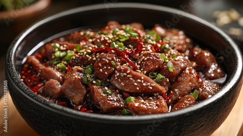 A fiery symphony of flavors, featuring a whole roasted duck adorned with a medley of dried chili segments, fragrant Sichuan peppercorns, aromatic spices, a vibrant red oil, and glistening sesame