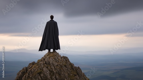 figure, cape, mountain, landscape, solitude, wonder, serenity, isolation, visual, awe, contemplation, escape, strength, exploration, iconic, dream, calmness, inspiration, challenge, symbolism, bravery, majestic, dramatic, shadow, power, perspective, stillness, elevation, cloud, panorama, character, outdoors, sky, journey, height, epic, viewpoint, scenery, scenic, beauty, nature, travel, adventure, heroism, mystique