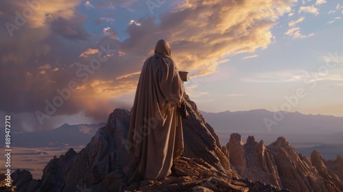 mountain, sunset, cloud, person, robe, landscape, sky, rock, mountain summit, horizon, peak, view, silhouette, standing, dramatic, colours, gold, hours, dusk, nature, scenery, travel, adventure, wilderness, solitude, serenity, beauty, awe, inspiration, contemplation, wonder, peace, calm, majestic, huge, distant, expansive, quiet, stillness
