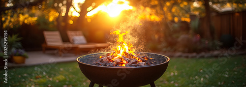 A fire is burning in a grill in a backyard. The fire is orange and yellow, and the grill is black. The scene is peaceful and relaxing, with a beautiful sunset in the background