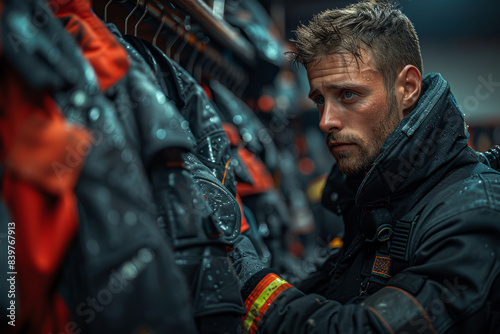 A firefighter checking equipment in the firehouse. Concept of readiness and bravery. Generative Ai.