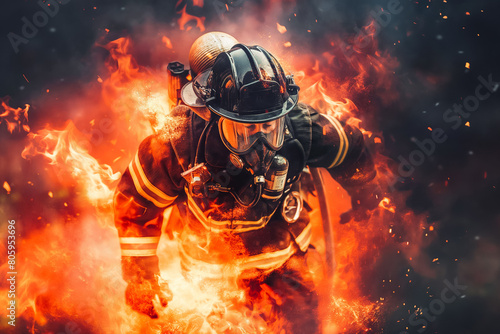 A firefighter rushes into a burning building, determination etched on their face as they save lives.