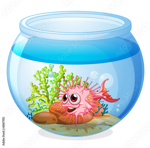 illustration, drawing, graphic, image, isolated, white, background, cartoon, jar, aquarium, glasses, plastic, bottle, fragile, breakable, container, storage, clear, transparent, visible, blue, decor, decorative, decoration, bowl, water, puffer, fish, animal, pet, living, creature, water, aquatic, marin, sanctuary, swim, swimming, reef, rock, stone, coral, clip art, clip art, design, template, seaweed, weed, green, vector