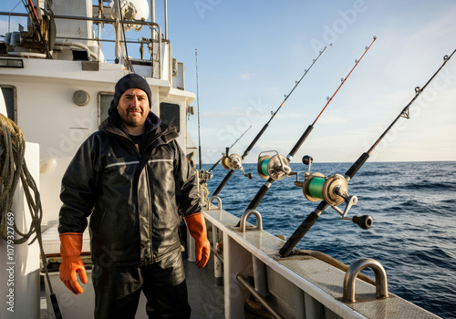 A fisherman preparing for a day of fishing on a boat in open waters during a clear morning
