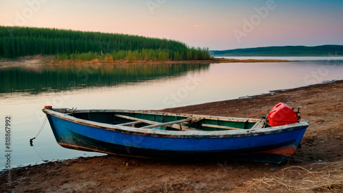 A fishing schooner on the shore of a picturesque bay.
